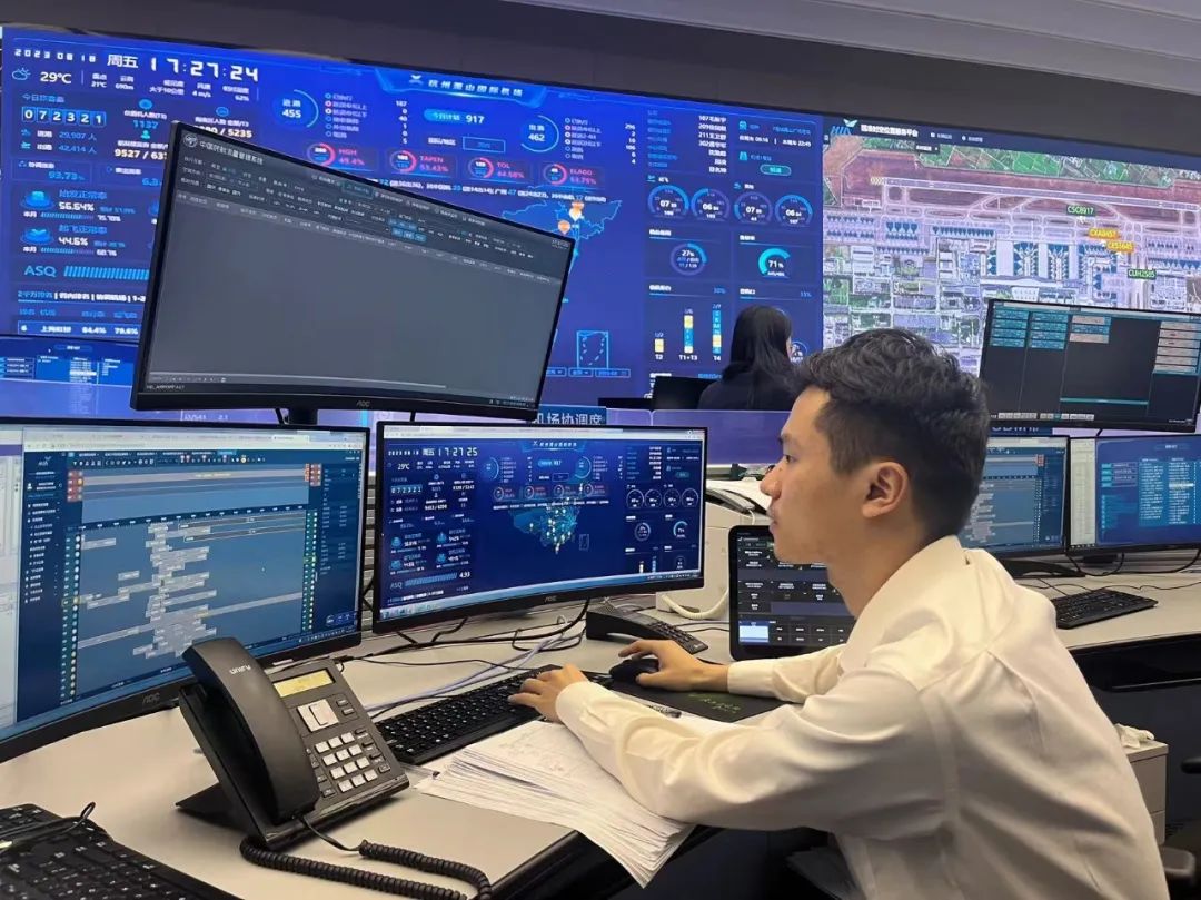 在杭州机场运行指挥大厅,指挥员陈蔚正在通过机位智能分配系统中的画面,实时监控一个正准备推出的南航航班。与以往指挥航班时各联席单位电话铃声此起彼伏的场景相比,指挥员只需要将主要精力用于机位冲突监控和机位分配优化。这样的转变得益于新航站楼投运智慧系统的全面应用。