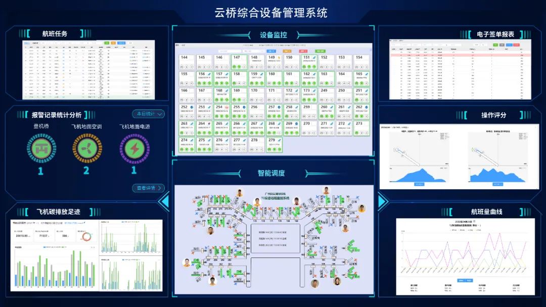 云桥设备综合管理系统由广州白云机场下属空港设备公司自主研发,依托云计算和物联网数据采集,以节能降碳为核心建设理念,从设备监控、航班调度、电子签单、碳足迹计算等各个方面为航企提供更优质的APU替代设施,成为绿色机场建设的重要基础设施之一。