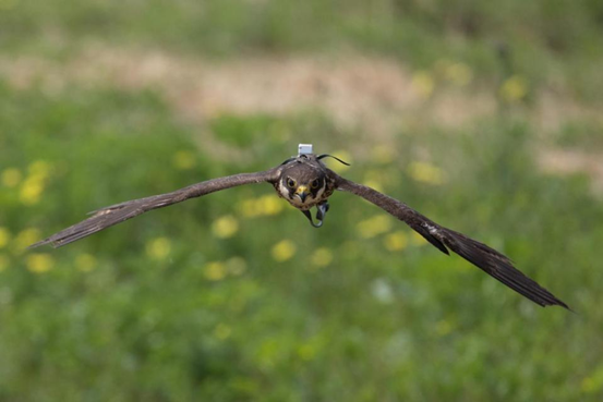 猎鹰进行低空盘旋驱鸟,其背部装有定位装置