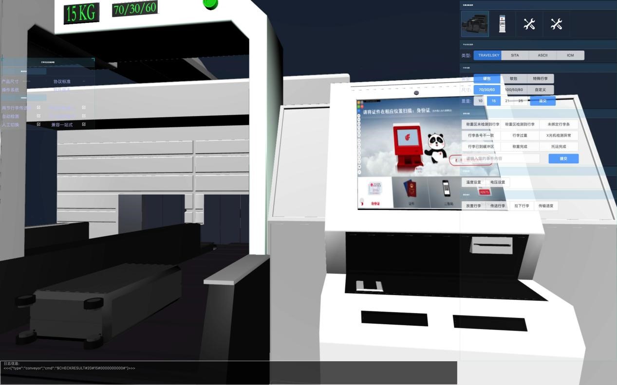 该仿真平台通过1∶1的3D建模等技术实现行李托运设备的三维可视化,同时根据仿真场景需要设置功能操作区,提供包括平台协议、行李类型、行李重量、仿真流程等选项,系统后端通过自研物联网平台与真实值机柜机进行数据通信。旅客在值机过程中按照页面提示输入证件信息并选择行李托运类型后,仿真平台便会模拟放置行李以及行李称重过程,将信息推送到值机柜机上。值机柜机使用真实设备,行李托运使用仿真平台,模拟行李放置和托运过程,实现托运设备缺失下的全流程装机测试验证。