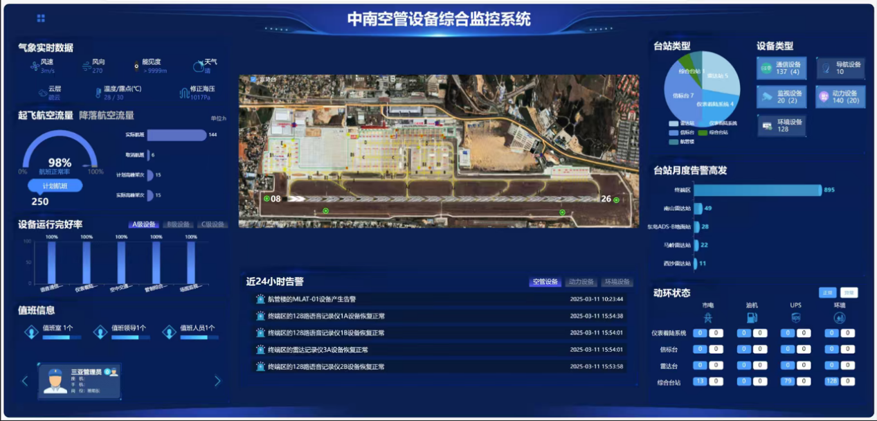 该系统通过多种方式对通信、导航、监视、动力设备、环境传感器等信息进行集中统一监控,实时显示设备的状态、参数,并在设备告警、预警时发出声光信号,使空管设备监控工作告别“人盯设备”的传统模式,通过绘制全域、实时、可视化的运行“一张图”,实现异常告警的精准推送与快速定位。