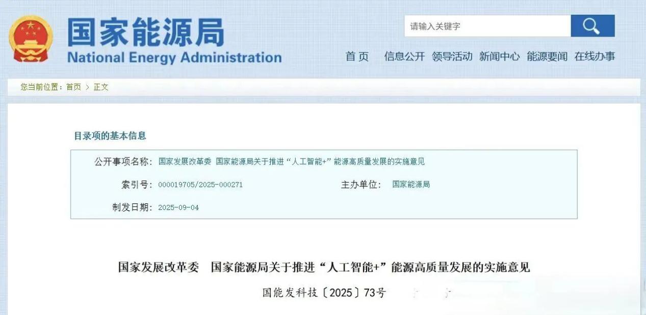 9月8日,国家发展改革委、国家能源局联合发布《关于推进“人工智能+”能源高质量发展的实施意见》(以下简称《实施意见》)。《实施意见》以拓展人工智能与能源领域深度融合应用场景为重要依托,以提升能源领域人工智能创新应用技术水平为主攻方向,以推进智能算力与电力协同发展为必要支撑,以健全能源智能化发展的创新体系为关键保障,提出分阶段目标:到2027年,推动五个以上专业大模型在电网、发电、煤炭、油气等行业深度应用,挖掘十个以上可复制、易推广、有竞争力的重点示范项目,探索百个典型应用场景赋能路径;到2030年,能源领域人工智能技术实现跨领域、跨行业、跨业务场景赋能,具身智能、科学智能等在关键场景实现落地应用,形成一批全球领先的“人工智能+”能源相关研发创新平台和复合人才培养基地,建成更加完善的政策体系。