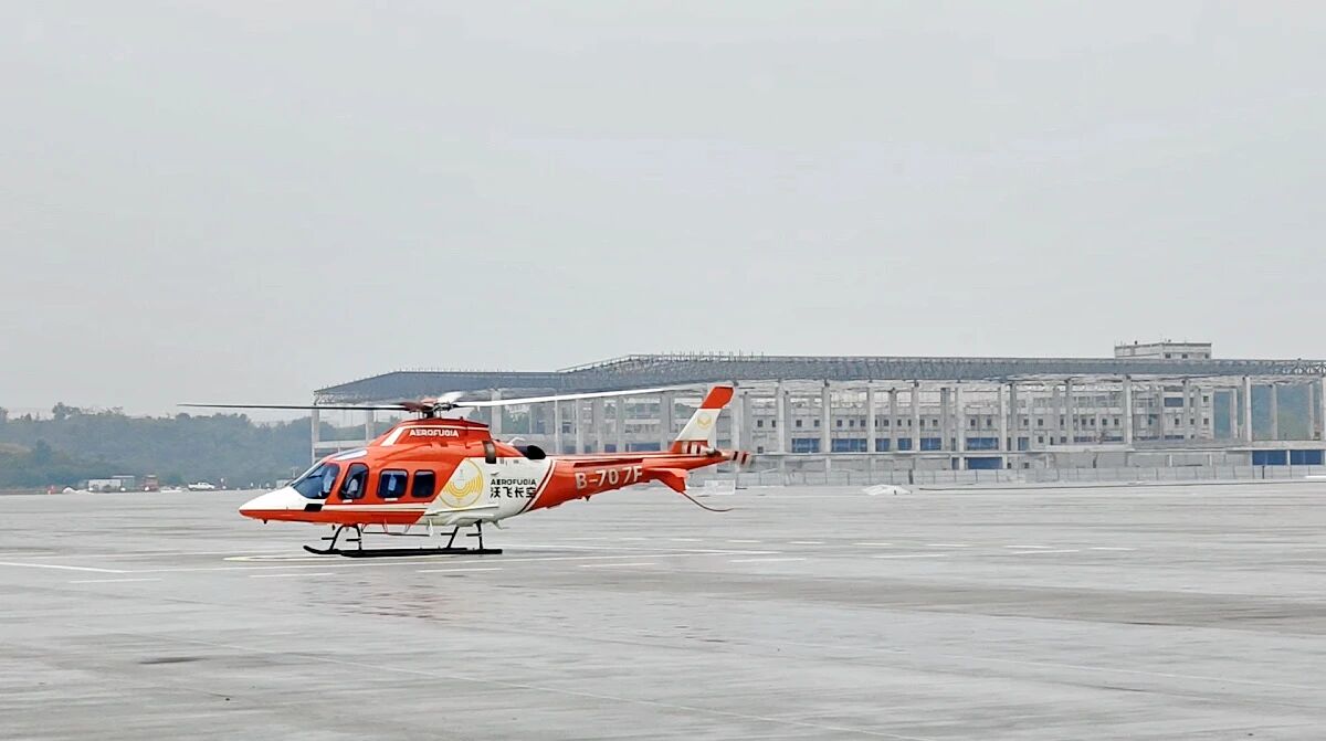 当日,在计划起飞前一小时天空飘起了细雨,但起降点能见度和云底高始终保持在飞行标准之上。上午9点30分,沃飞长空的橙红色阿古斯塔AW109型直升机准时从欧洲中心楼顶起飞。起飞的同时,该飞行任务ID代码图标出现在民航二所北斗公司研发的"低空飞行运行保障系统"界面上,一条红色虚线清晰勾勒出它的航迹。直升机向东穿越龙泉山脉,直奔示范验证机场。9点42分,伴随着由远及近的轰鸣声,“来了!来了!”现场响起阵阵欢呼。全程仅用12分钟,直升机便稳稳降落在指定起降点,为民航科技创新示范区迎来了首位"空中访客"。10点整,直升机按计划安全返航。